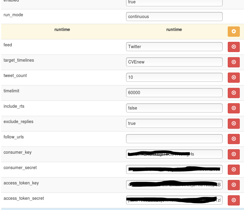 "cve-twitter-collector": { "parameters": { "feed": "Twitter", "target_timelines": "https://twitter.com/CVEnew ", "tweet_count": 10, "timelimit": 60000, "include_rts": false, "exclude_replies": true, "follow_urls": "", "consumer_key": "myconsumer_key ", "consumer_secret": "myconsumer_secret ", "access_token_key": "myaccess_token_key ", "access_token_secret": "myaccess_token_secret " }, "name": "Twitter", "group": "Collector", "module": "intelmq.bots.collectors.twitter.collector_twitter", "description": "Collects tweets from target_timelines. Maximum number of tweet_count from each timeline and up to timelimit back in time.", "enabled": true, "run_mode": "continuous" }